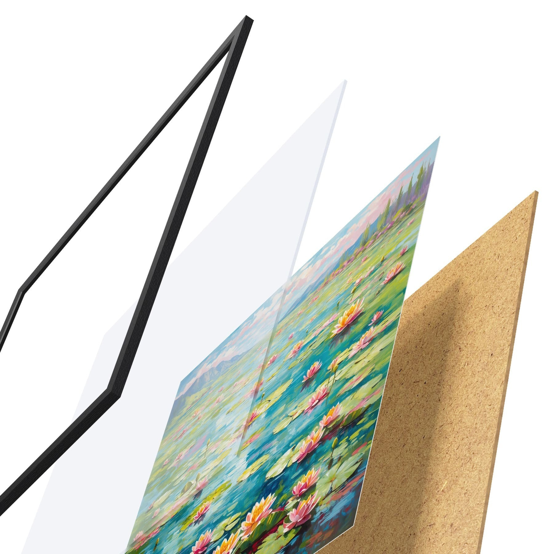L’affiche encadrée est composée d’un cadre, d’un plexiglas, d’une image imprimée et d’un support en aggloméré. Elle est prête à être accrochée au mur grâce aux fixations situées à l’arrière.