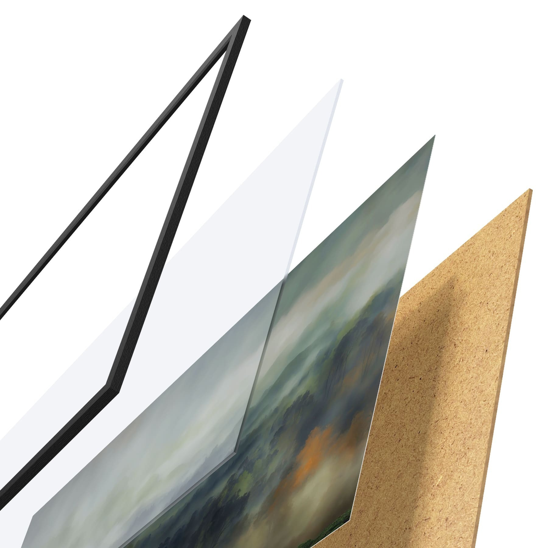 L’affiche encadrée est composée d’un cadre, d’un plexiglas, d’une image imprimée et d’un support en aggloméré. Elle est prête à être accrochée au mur grâce aux fixations situées à l’arrière.