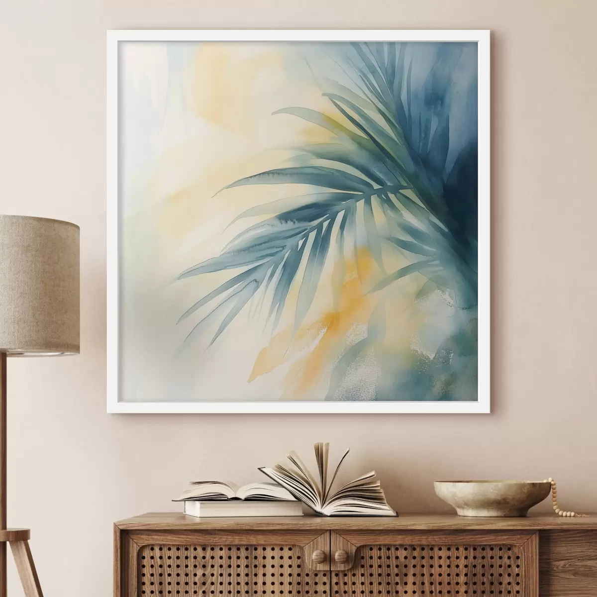 Poster Des feuilles de palmier tropicales dans une palette bleu-turquoise, sur fond de taches d'aquarelle aux teintes chaudes f48849