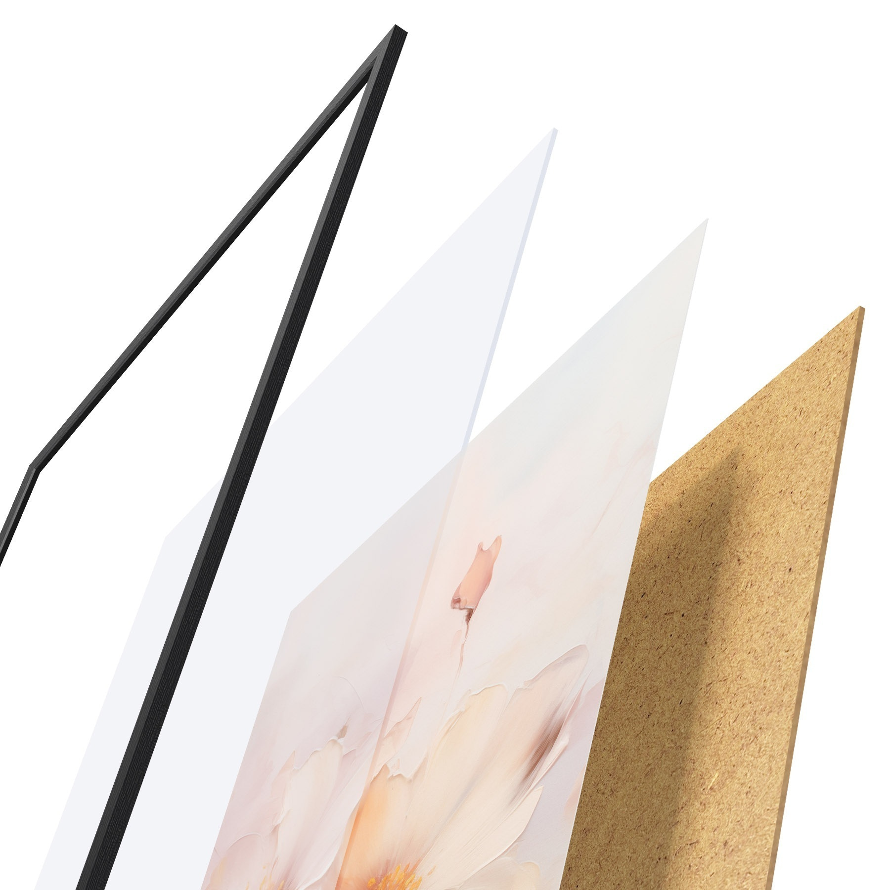 L’affiche encadrée est composée d’un cadre, d’un plexiglas, d’une image imprimée et d’un support en aggloméré. Elle est prête à être accrochée au mur grâce aux fixations situées à l’arrière.