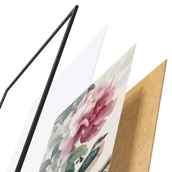 L’affiche encadrée est composée d’un cadre, d’un plexiglas, d’une image imprimée et d’un support en aggloméré. Elle est prête à être accrochée au mur grâce aux fixations situées à l’arrière.