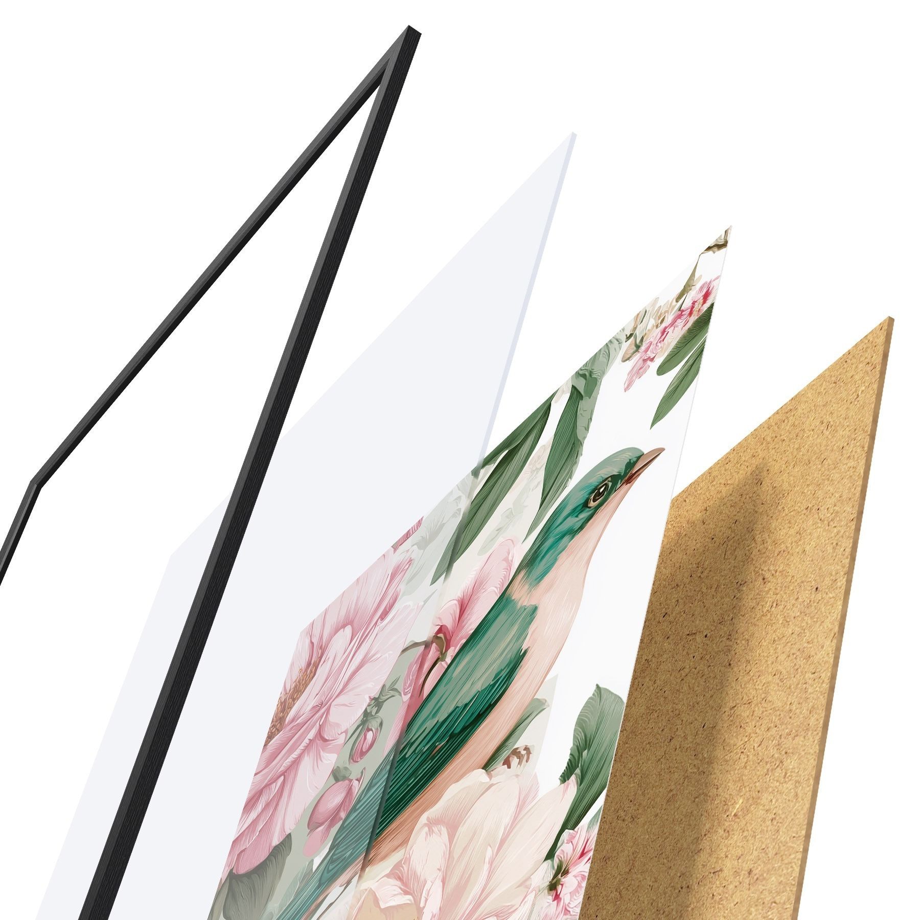 L’affiche encadrée est composée d’un cadre, d’un plexiglas, d’une image imprimée et d’un support en aggloméré. Elle est prête à être accrochée au mur grâce aux fixations situées à l’arrière.