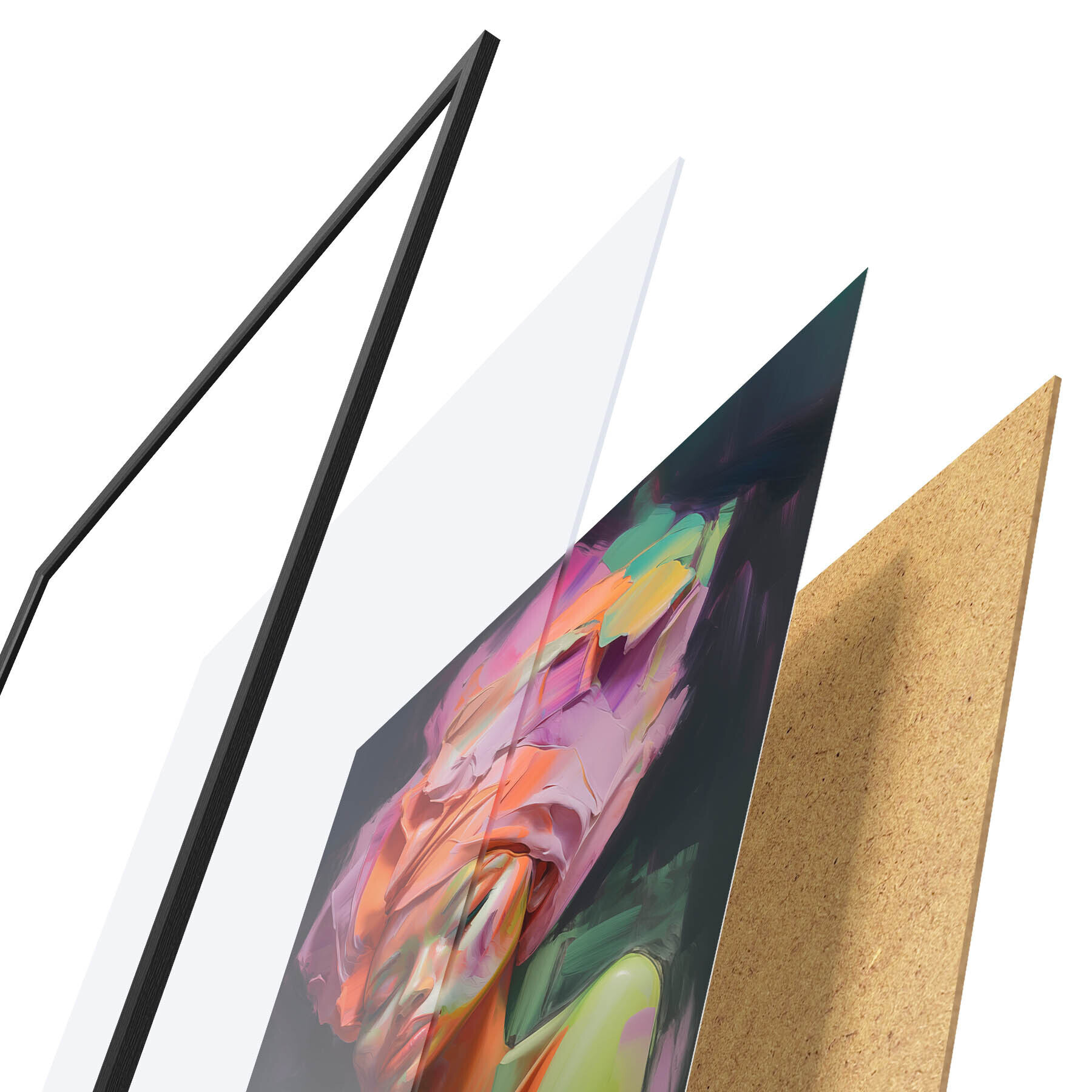 L’affiche encadrée est composée d’un cadre, d’un plexiglas, d’une image imprimée et d’un support en aggloméré. Elle est prête à être accrochée au mur grâce aux fixations situées à l’arrière.