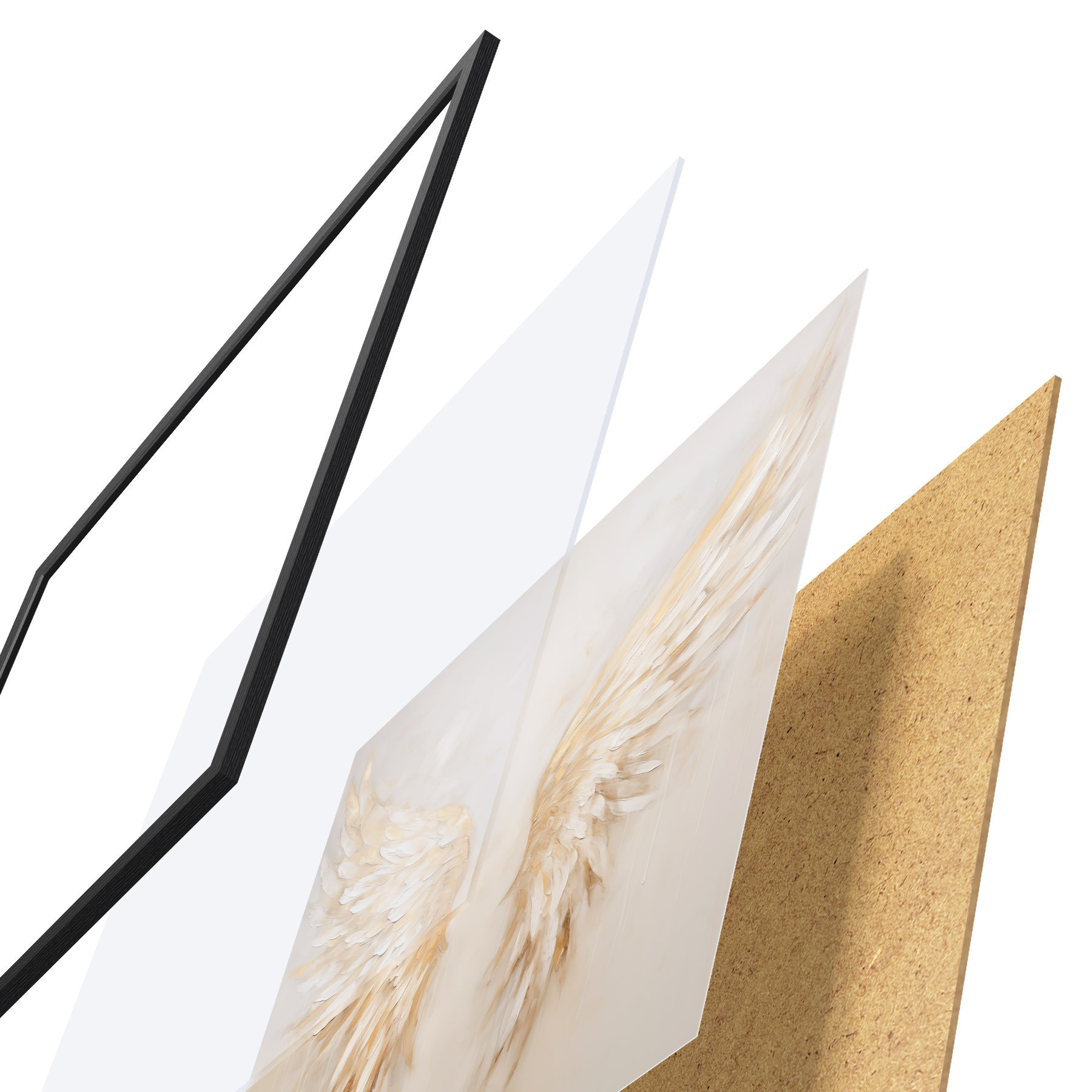 L’affiche encadrée est composée d’un cadre, d’un plexiglas, d’une image imprimée et d’un support en aggloméré. Elle est prête à être accrochée au mur grâce aux fixations situées à l’arrière.