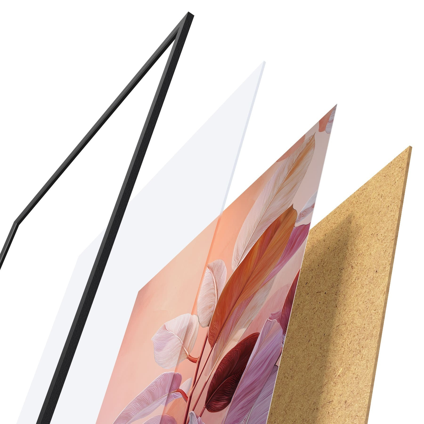 L’affiche encadrée est composée d’un cadre, d’un plexiglas, d’une image imprimée et d’un support en aggloméré. Elle est prête à être accrochée au mur grâce aux fixations situées à l’arrière.