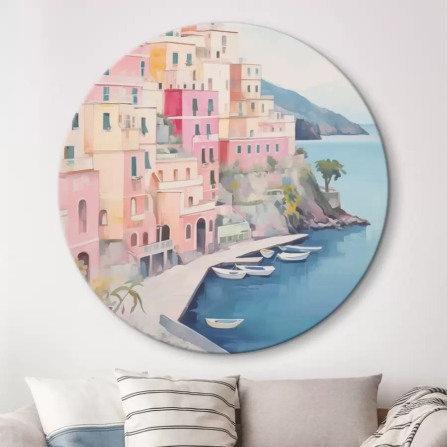Tableaux rondes Ville italienne, côte maritime, cocktails, vocation, architecture, été, aquarelle