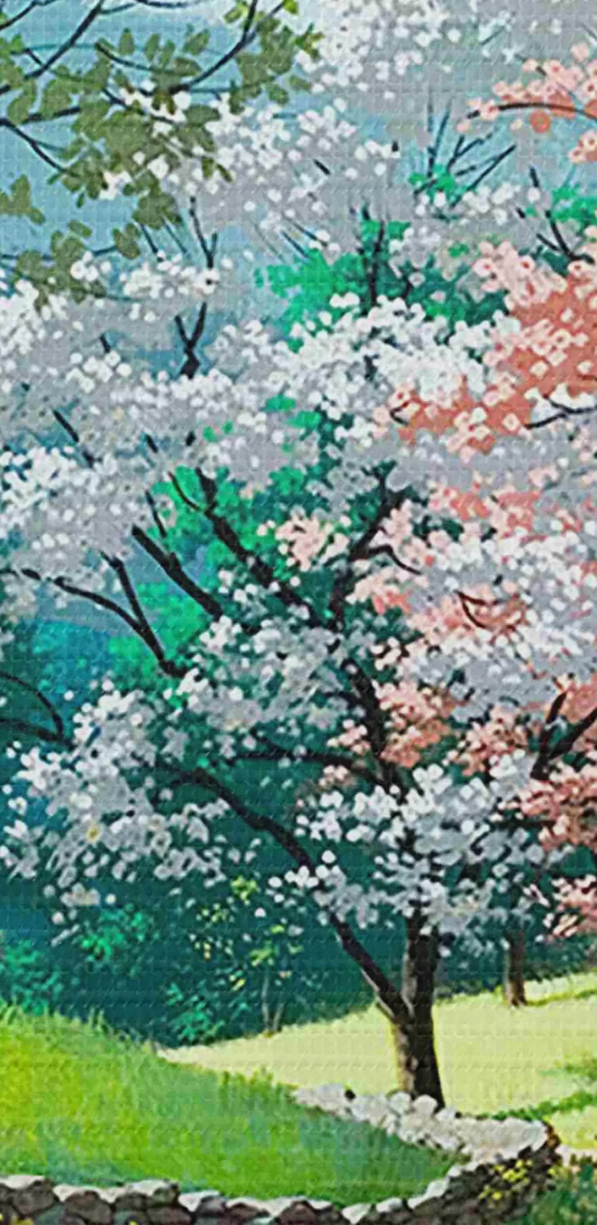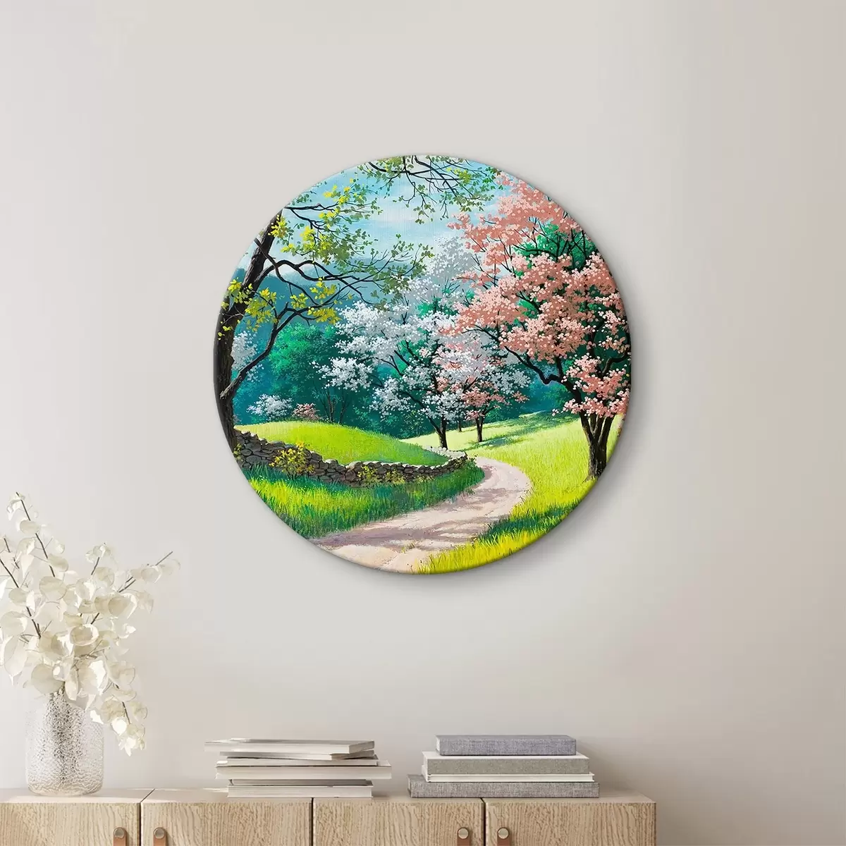 Tableaux rondes Arbres fruitiers en fleurs, chemin de campagne Nr r15350
