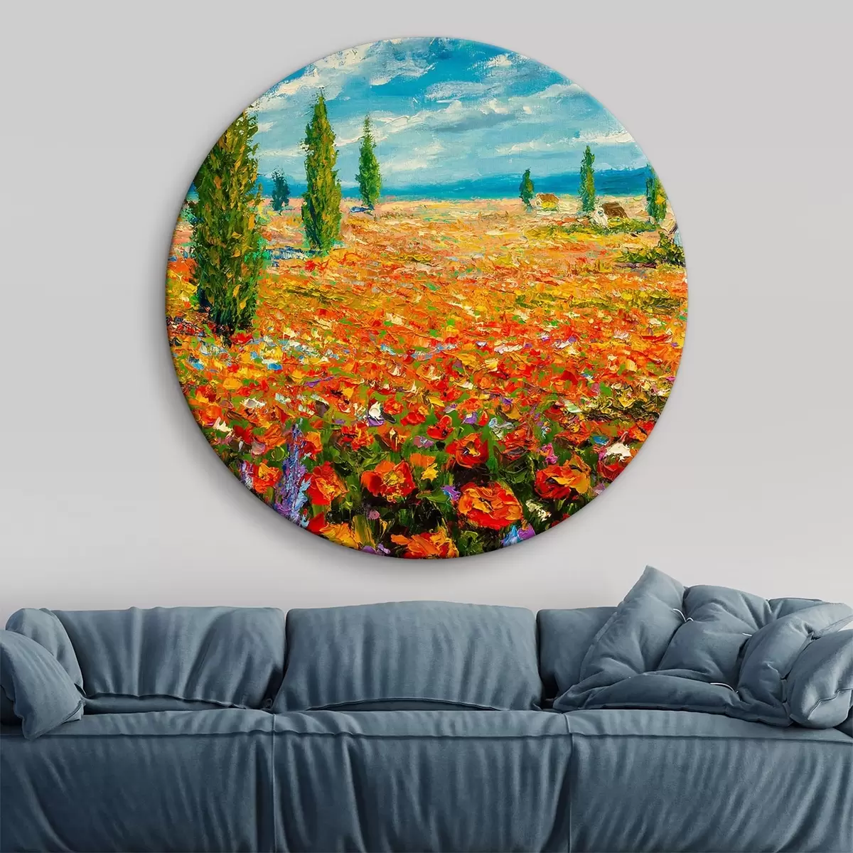 Tableaux rondes Champ de coquelicots sur fond de ciel bleu Nr r34956