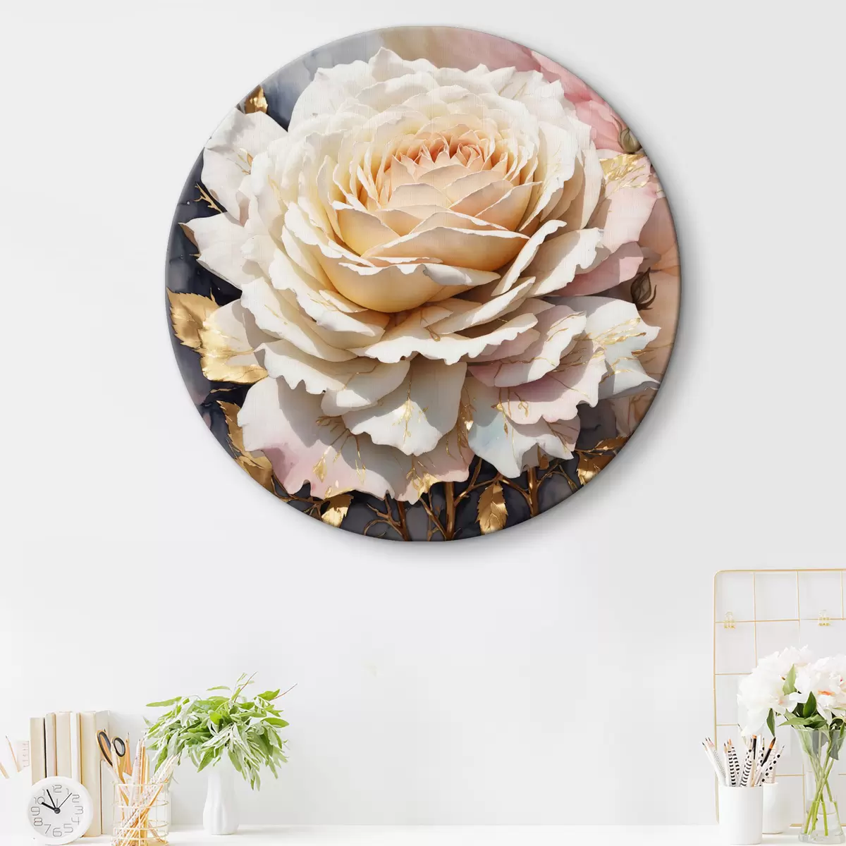 Tableaux rondes Rose blanche à l'aquarelle avec des feuilles dorées r35662