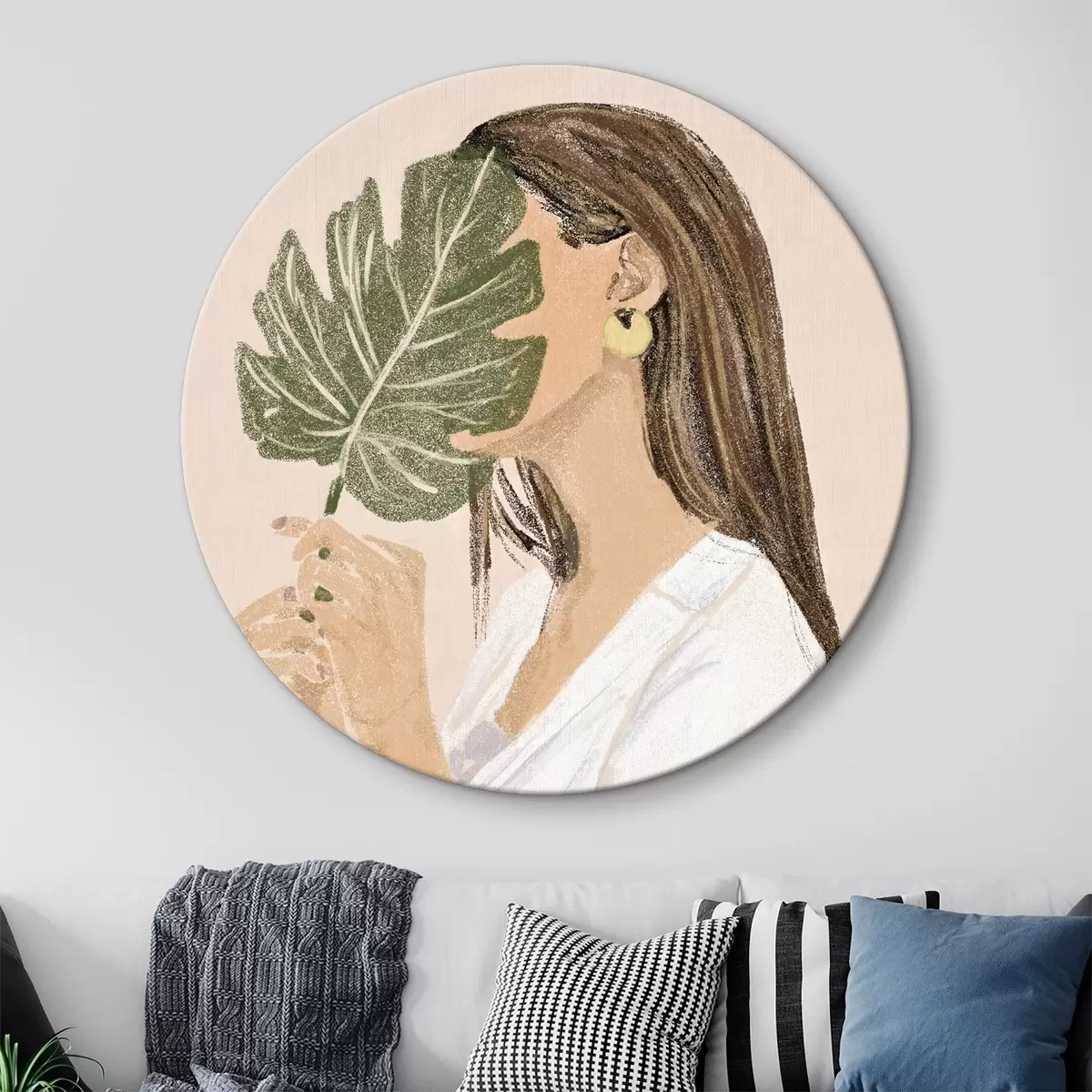 Tableaux rondes Femme avec feuille tropicale et élégance naturelle Nr r35800