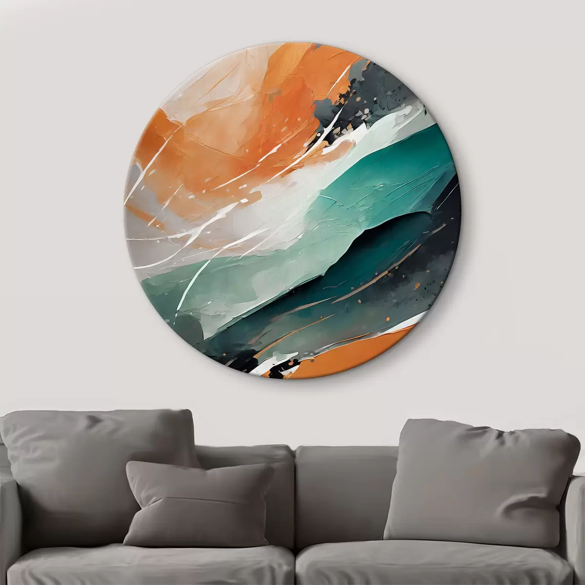 Tableaux rondes Art acrylique abstrait, coup de pinceau, texture de peinture, couleurs orange, bleu Nr r36497