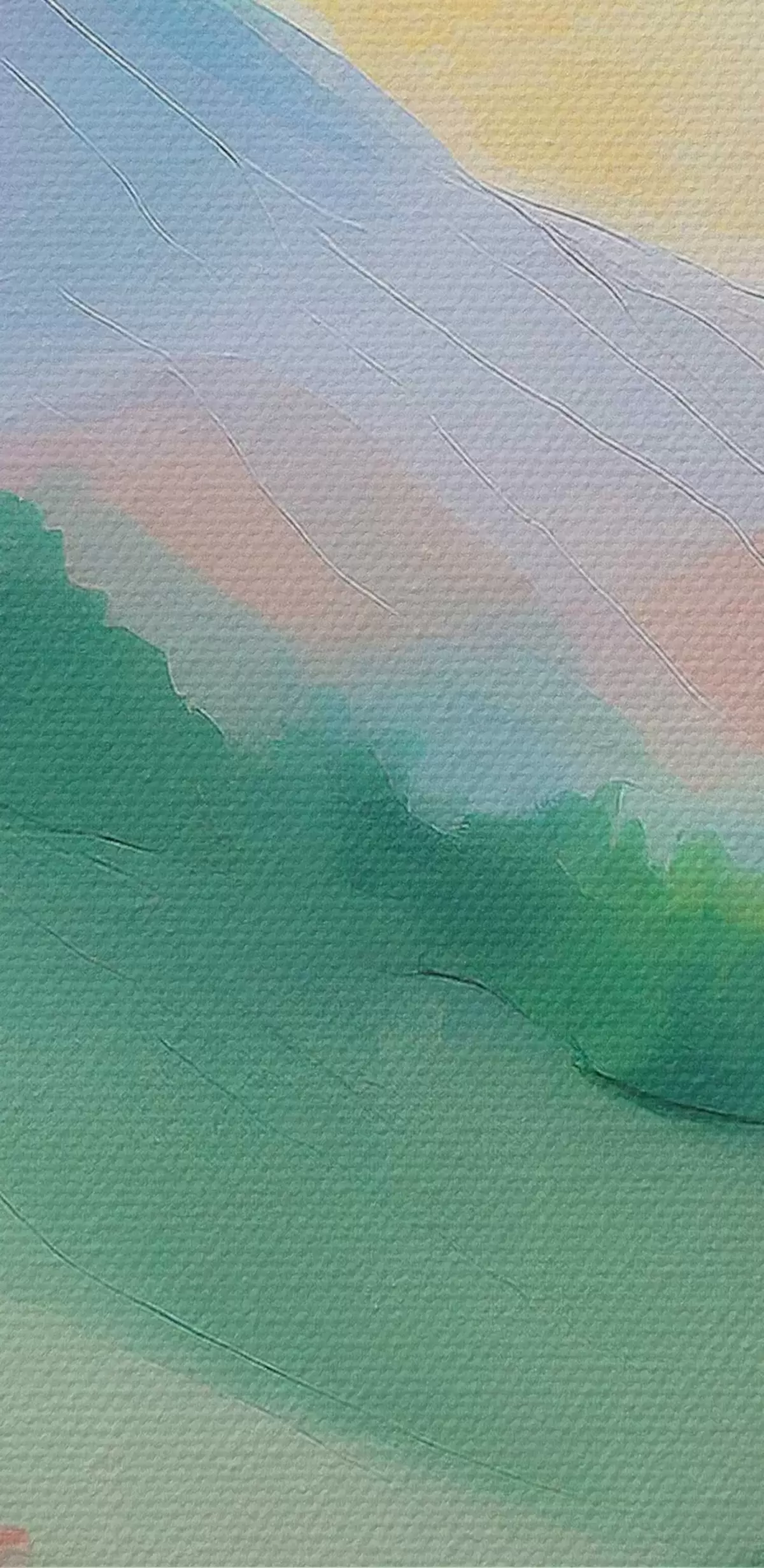 Tableaux rondes Dessin acrylique Paysage naturel, couleurs du coucher de soleil, montagnes, arbres, prairie Nr r36505