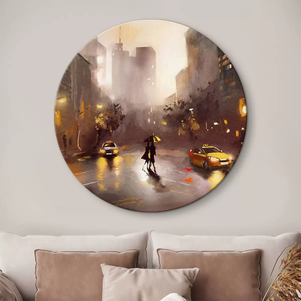Tableaux rondes Personne avec un parapluie marchant dans une rue mouillée avec des voitures et des bâtiments Nr r36600