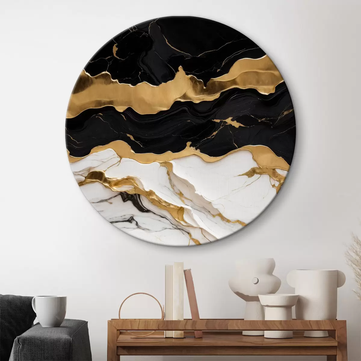 Tableaux rondes Abstraction en noir et blanc sur marbre avec ligne Nr r36636