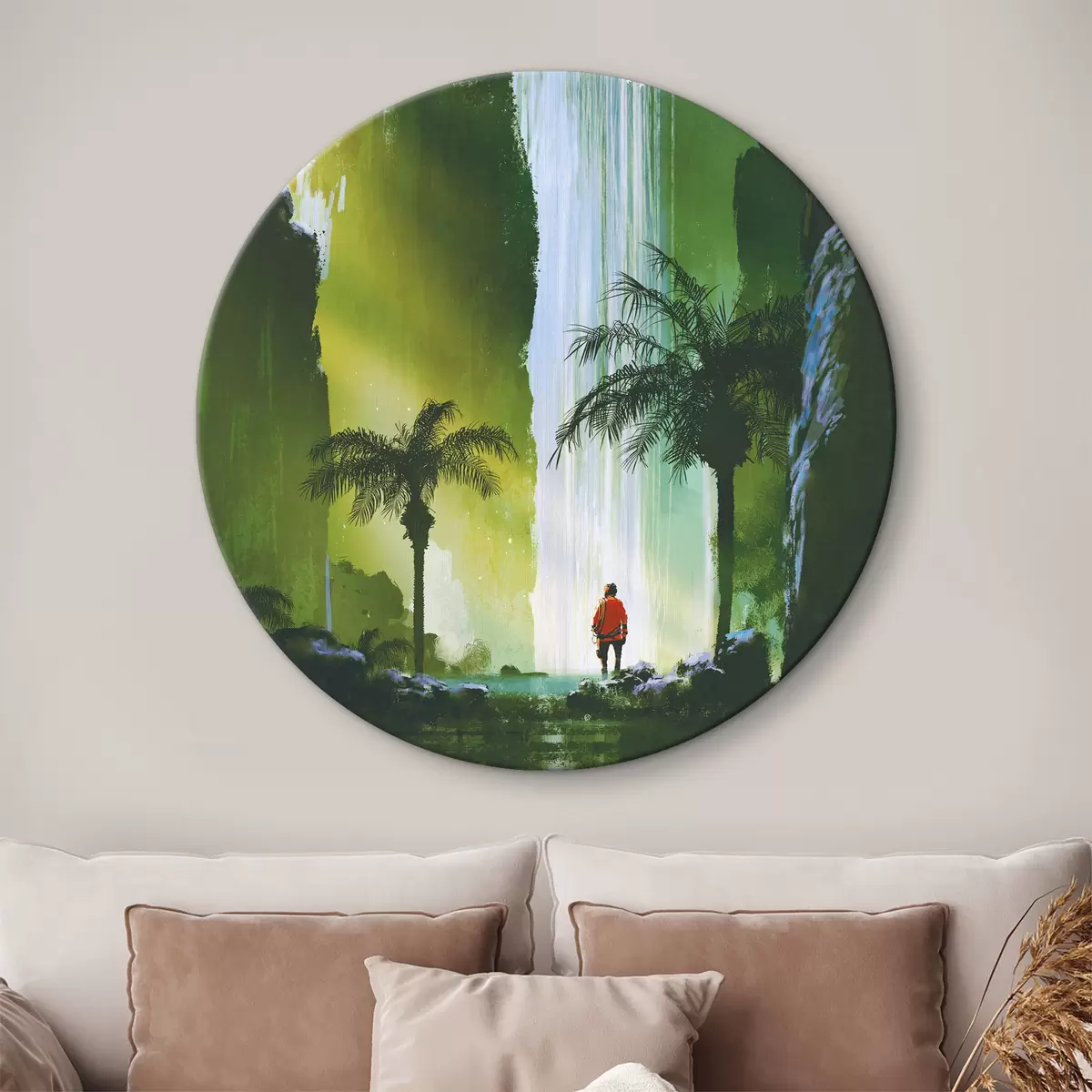 Tableaux rondes Un homme se promenant dans la forêt avec une chute d'eau r37080