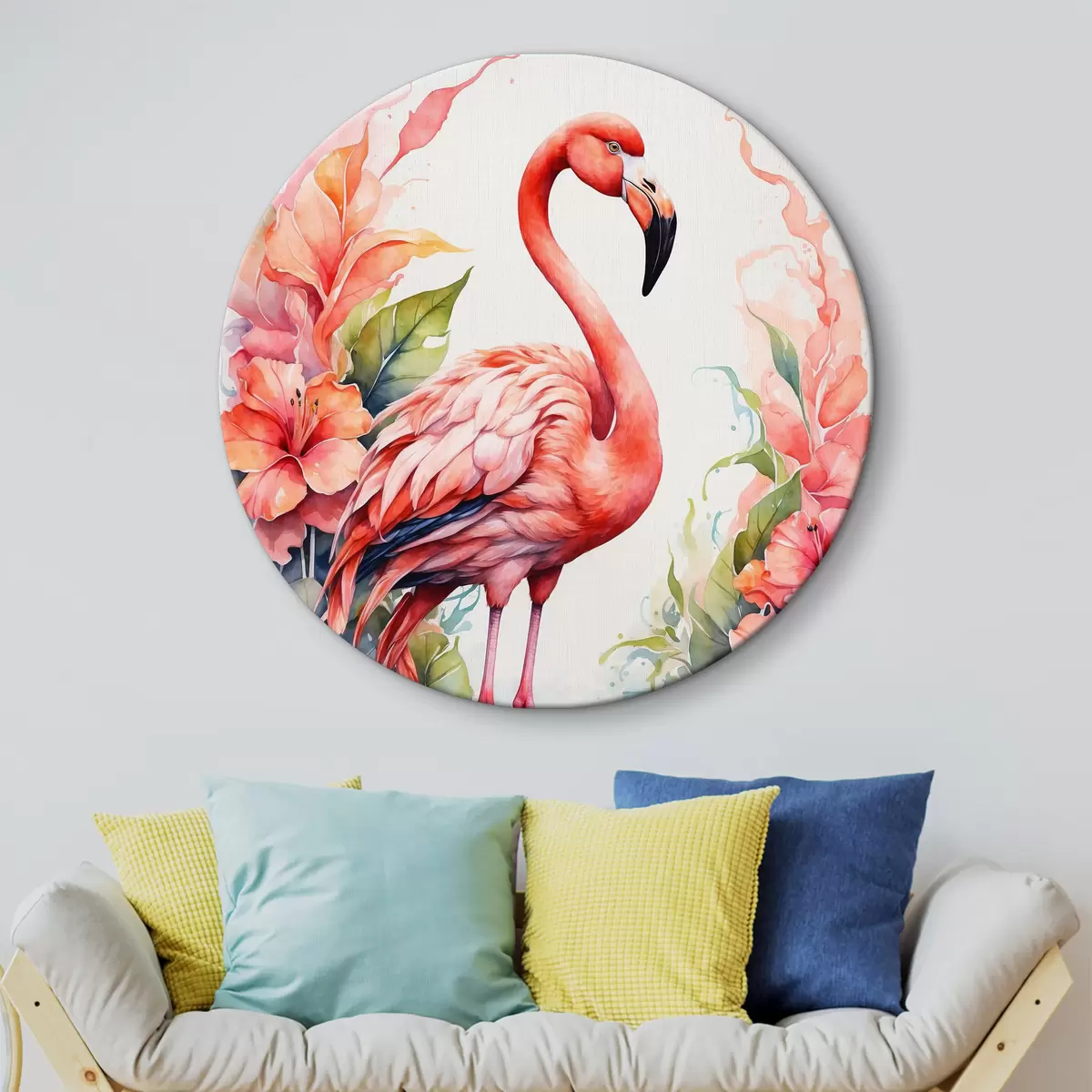 Tableaux rondes Flamant avec des fleurs en aquarelle r37125