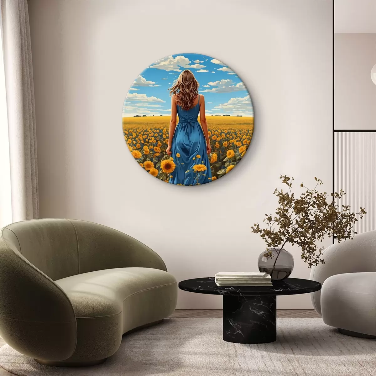 Tableaux rondes Femme en robe bleue dans un champ de tournesols Nr r37164