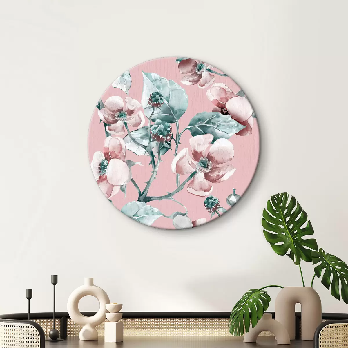Tableaux rondes Fleurs sur fond rose Nr r37296