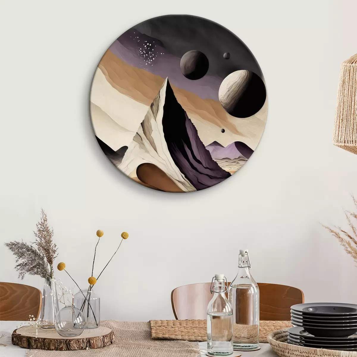 Tableaux rondes Art abstrait, désert, montagnes et rochers, violet et beige, espace r37362