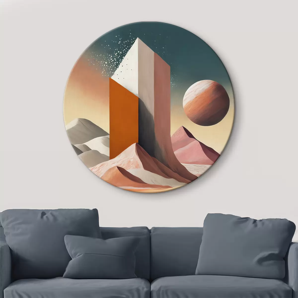 Tableaux rondes Art futuriste, désert, figures géométriques, palmiers, rose et orange, planète r37369
