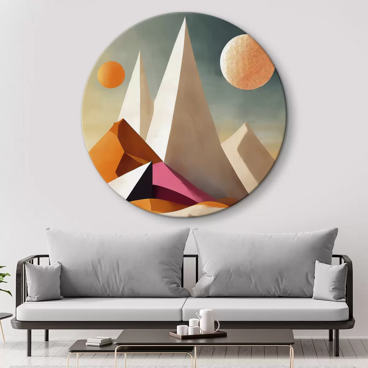 Tableaux rondes Art géométrique, abstraction, rose et orange, cosmique, désert avec rochers r37370