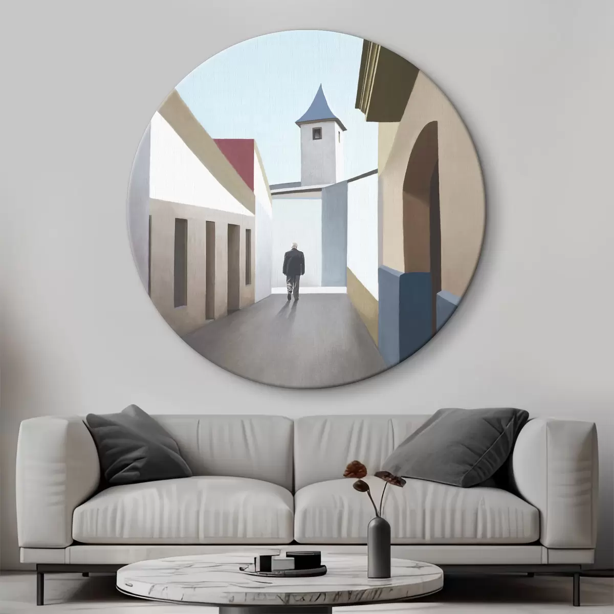 Tableaux rondes Un homme marchant dans une rue étroite r37784