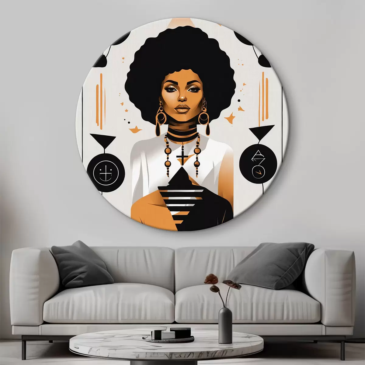 Tableaux rondes Une femme avec une grande coupe afro, une chemise blanche et des boucles d'oreilles Nr r37793