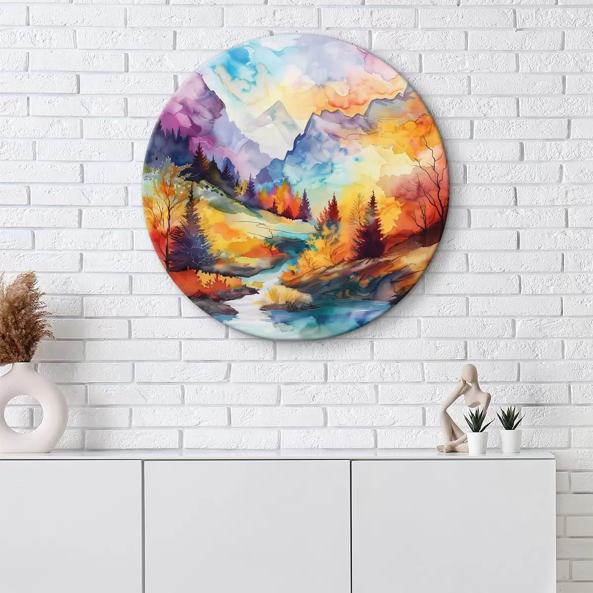 Tableaux rondes Paysage de montagne coloré avec arbres et rivière Nr r38145