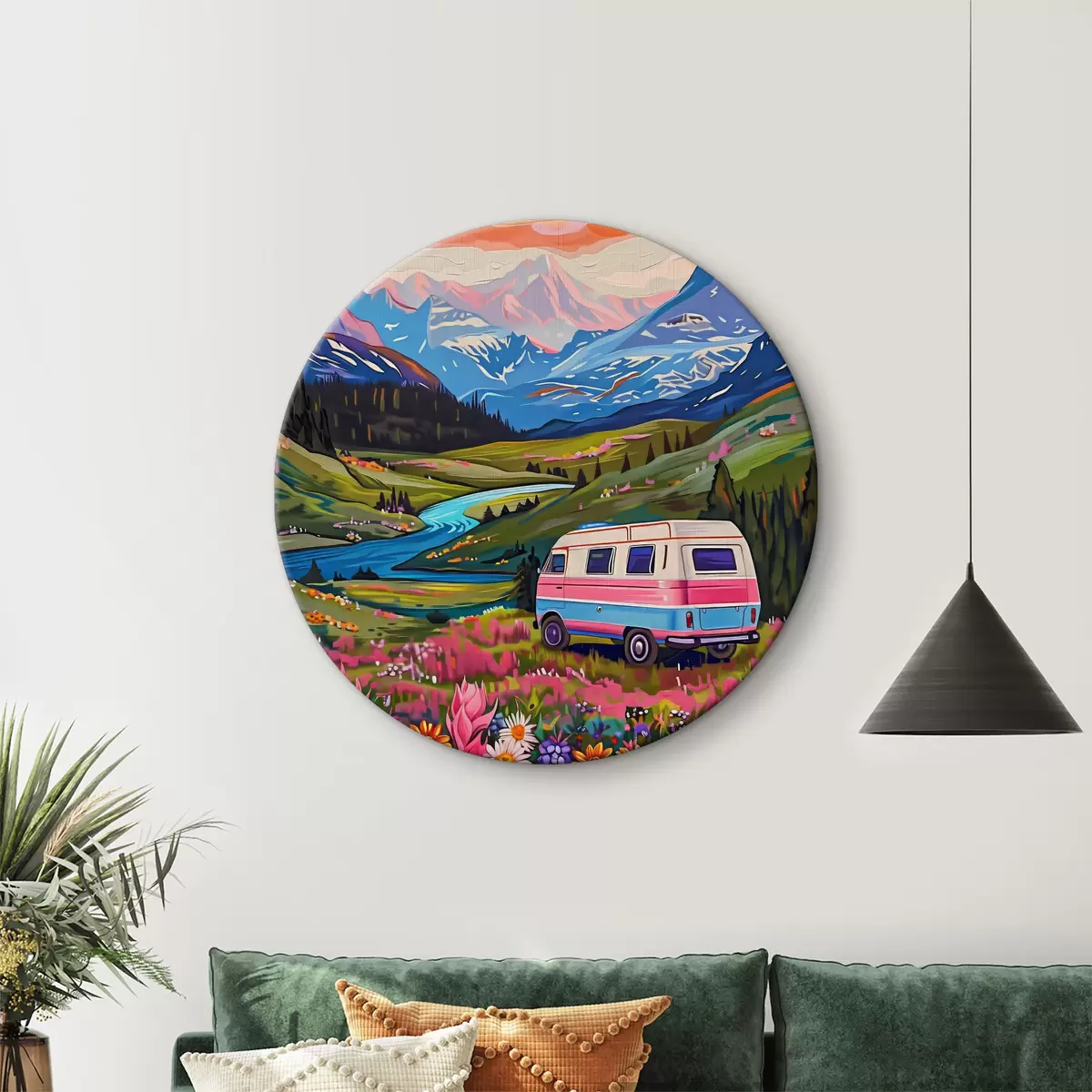 Tableaux rondes Une camionnette traversant une vallée avec des fleurs et des montagnes r38259