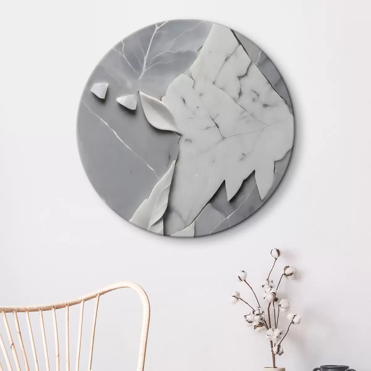Tableaux rondes Surface en marbre blanc et gris avec des feuilles Nr r38272