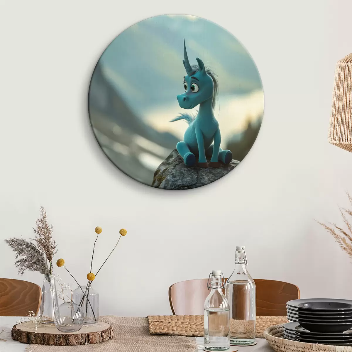 Tableaux rondes Dessin d'une licorne bleue assise sur un rocher Nr r38274