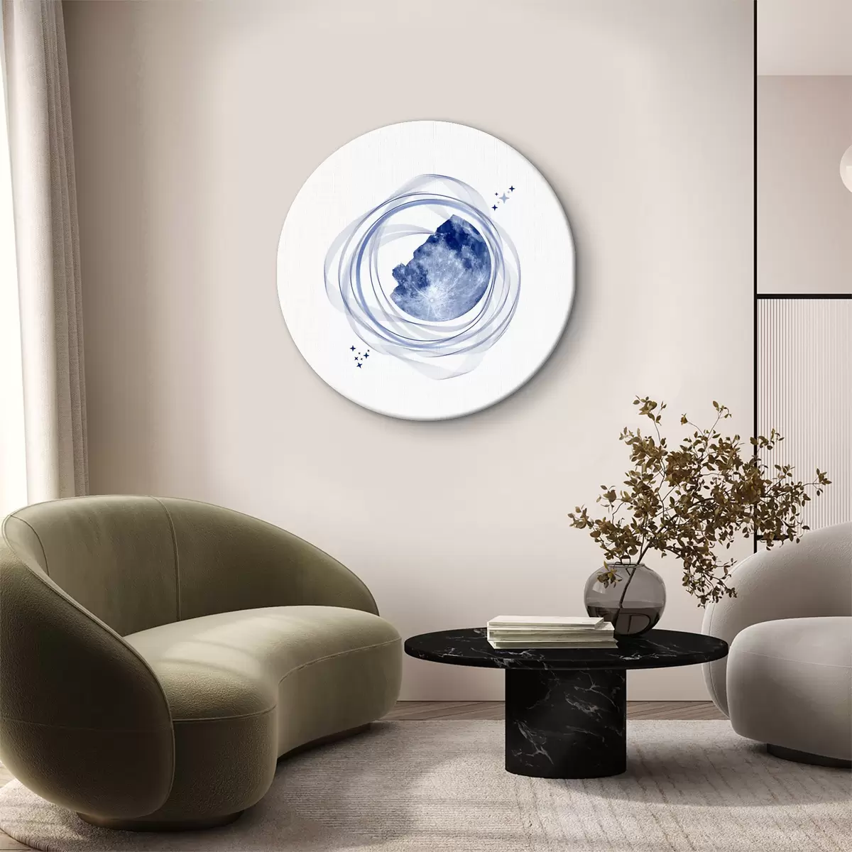 Tableaux rondes Orbite lunaire, croissant, minimalisme, espace, temps, lignes courbes floues, étoiles, galaxie, couleur bleue Nr r38280