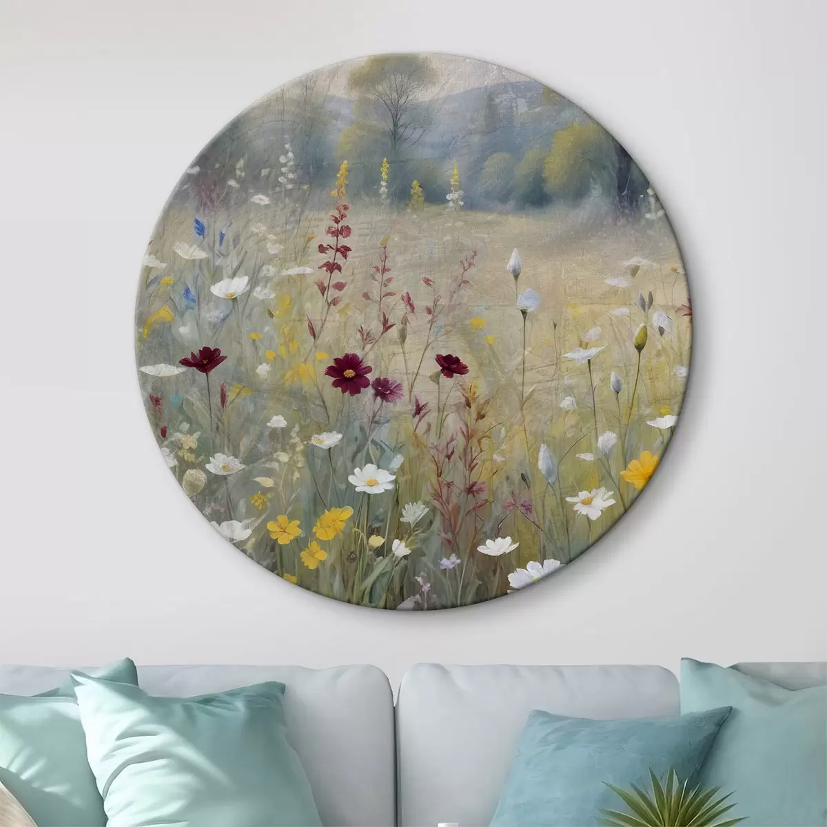 Tableaux rondes Une prairie colorée avec des fleurs sauvages avec une forêt floue en arrière-plan Nr r38368