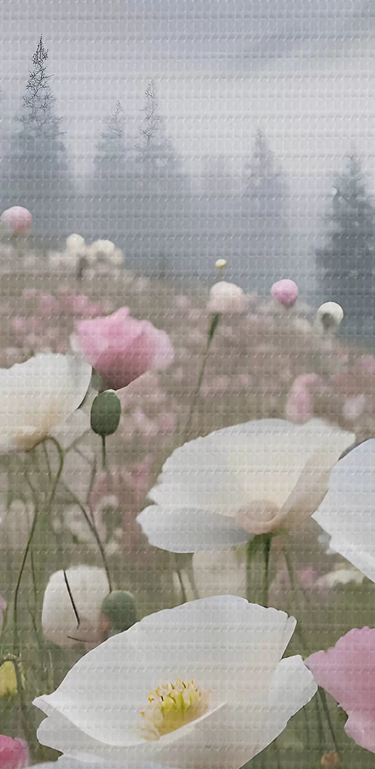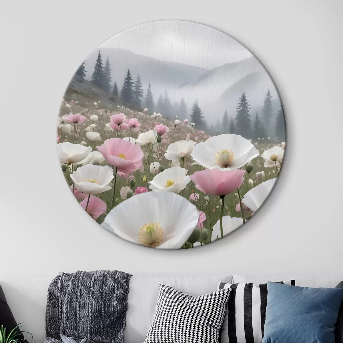 Tableaux rondes Un champ de coquelicots roses et blancs dans le paysage de montagne en arrière-plan Nr r38369
