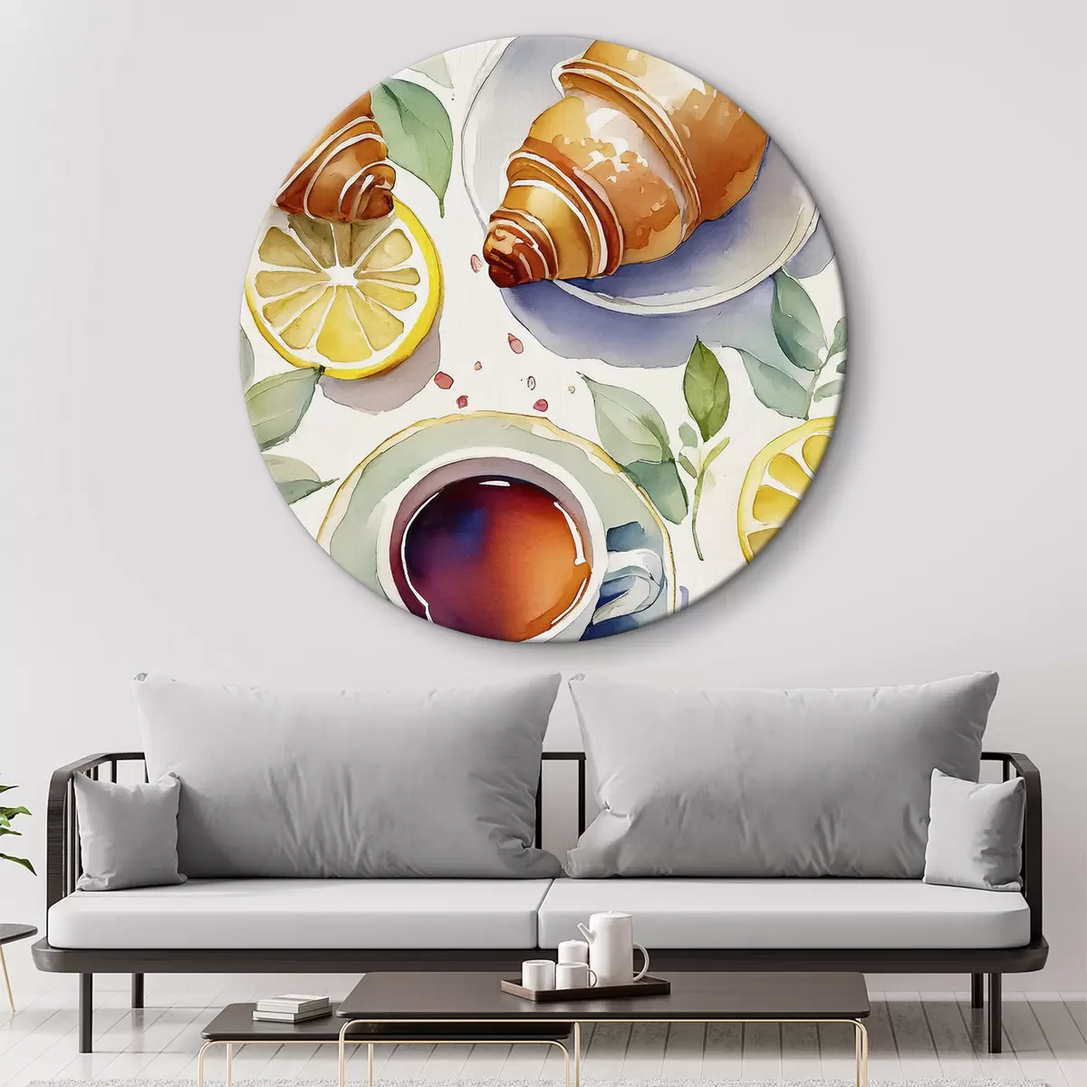 Tableaux rondes Aquarelle croissant, tasse de thé, petit déjeuner, citrons, style rustique Nr r38389