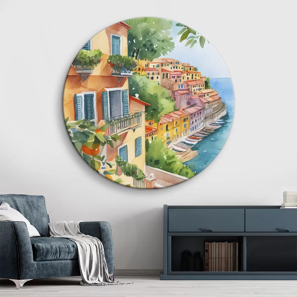 Tableaux rondes Architecture de la ville italienne, côte de la mer amalfitaine, été, aquarelle, citronnier r38393