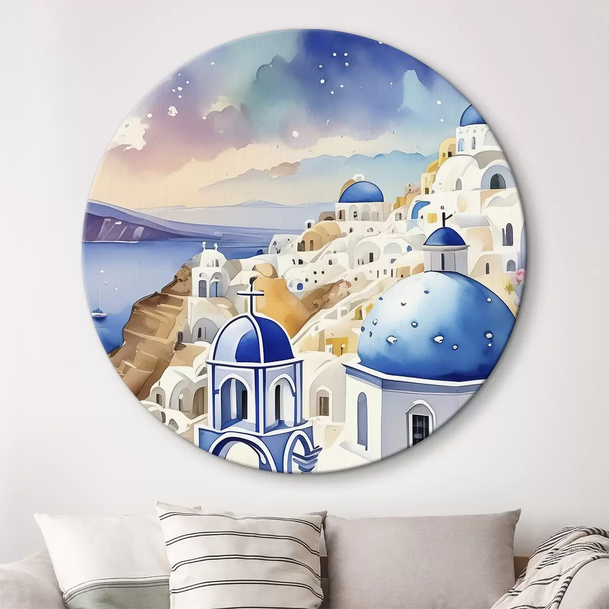 Tableaux rondes Santorin, Grèce architecture, aquarelle, fleurs, côte de la mer Méditerranée r38401