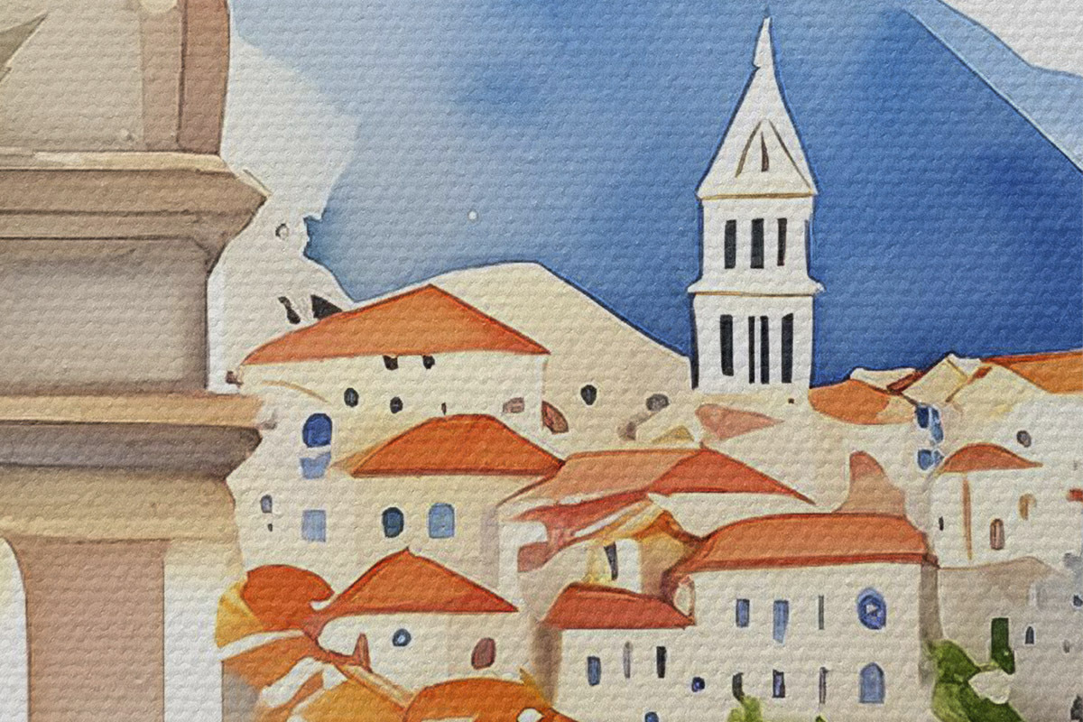 Tableaux rondes Architecture méditerranéenne, aquarelle, fleurs d'été, mer bleue, montagnes Nr r38408