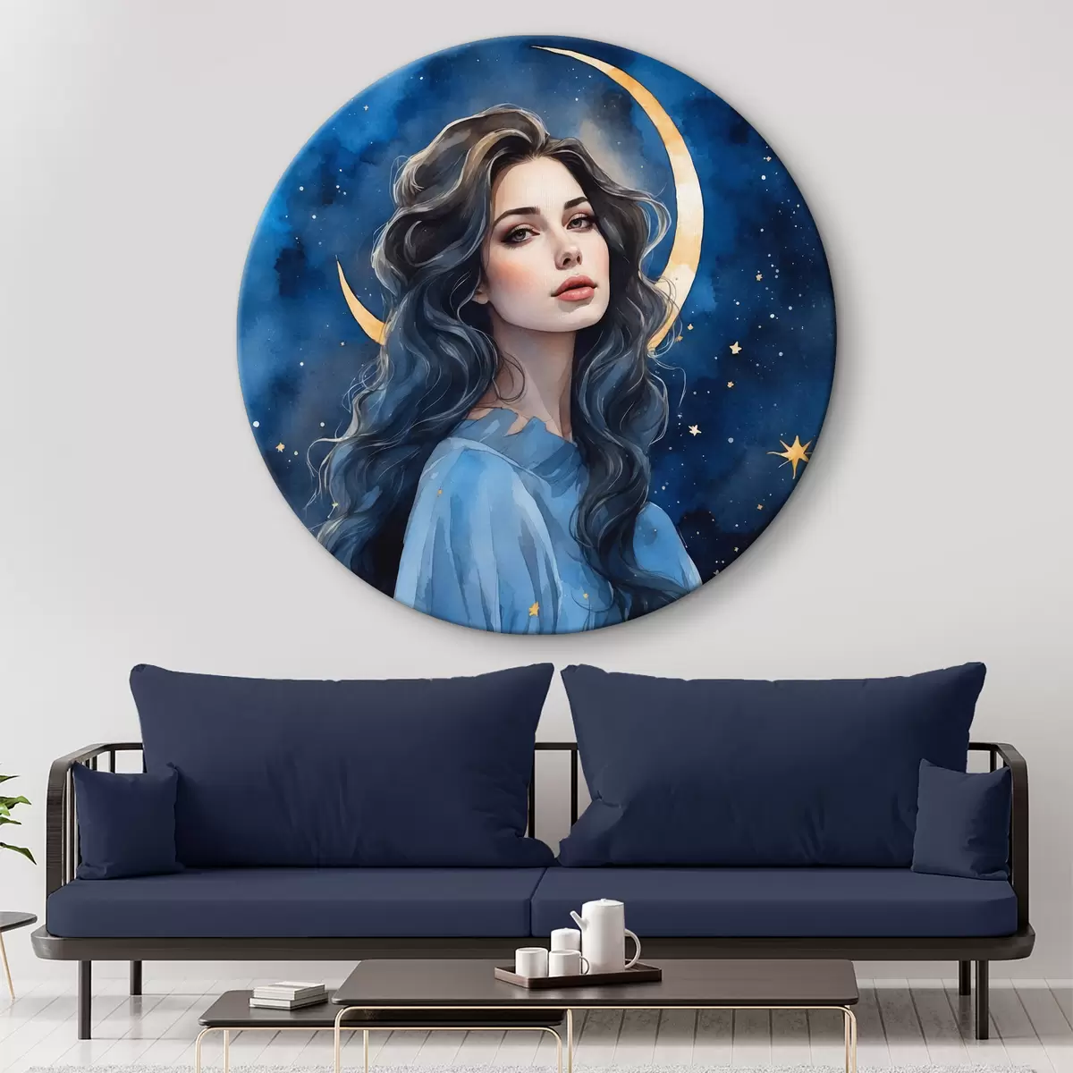 Tableaux rondes Fille en robe bleue sur fond de croissant de lune et d'étoiles Nr r38427