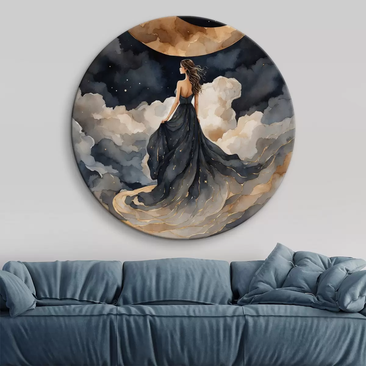 Tableaux rondes Femme en robe bleue et lune dans le ciel Nr r38428