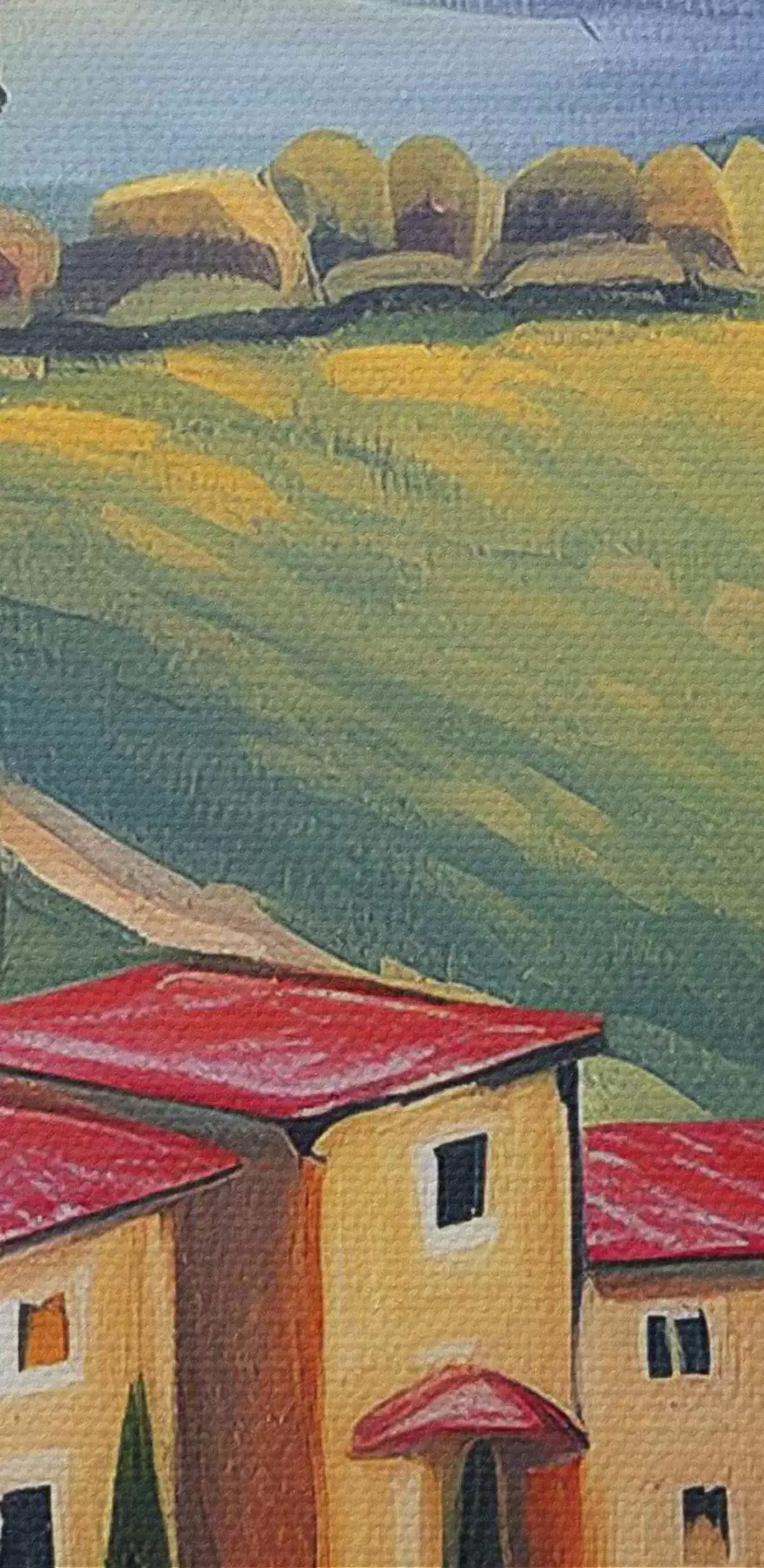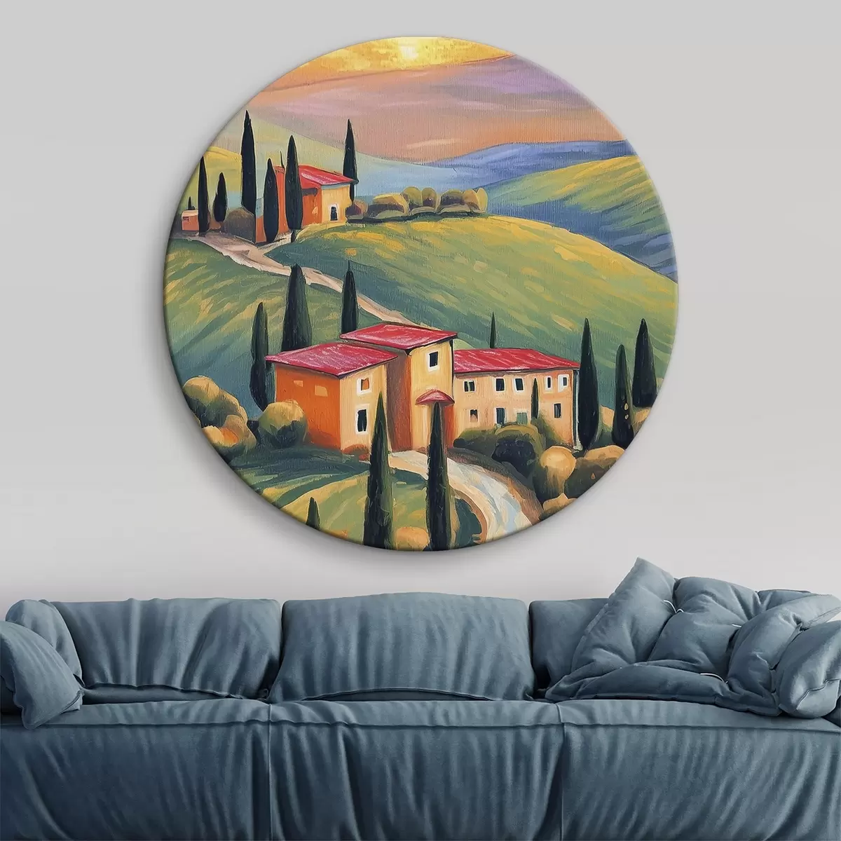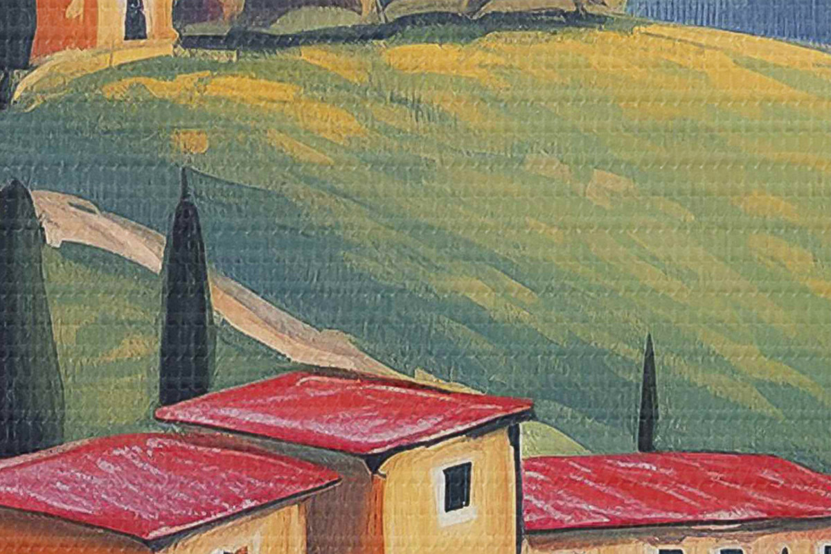 Tableaux rondes Paysages de Toscane, Italie, art acrylique, vieilles maisons, champs, été r38488