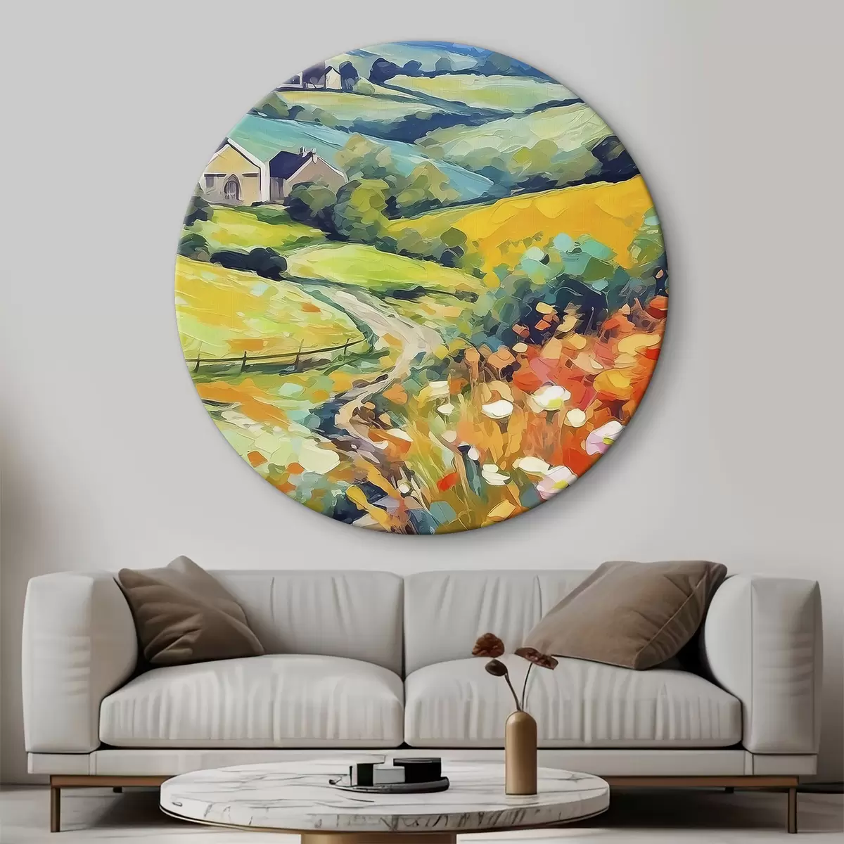 Tableaux rondes Peinture représentant un paysage avec des maisons et des champs Nr r38501