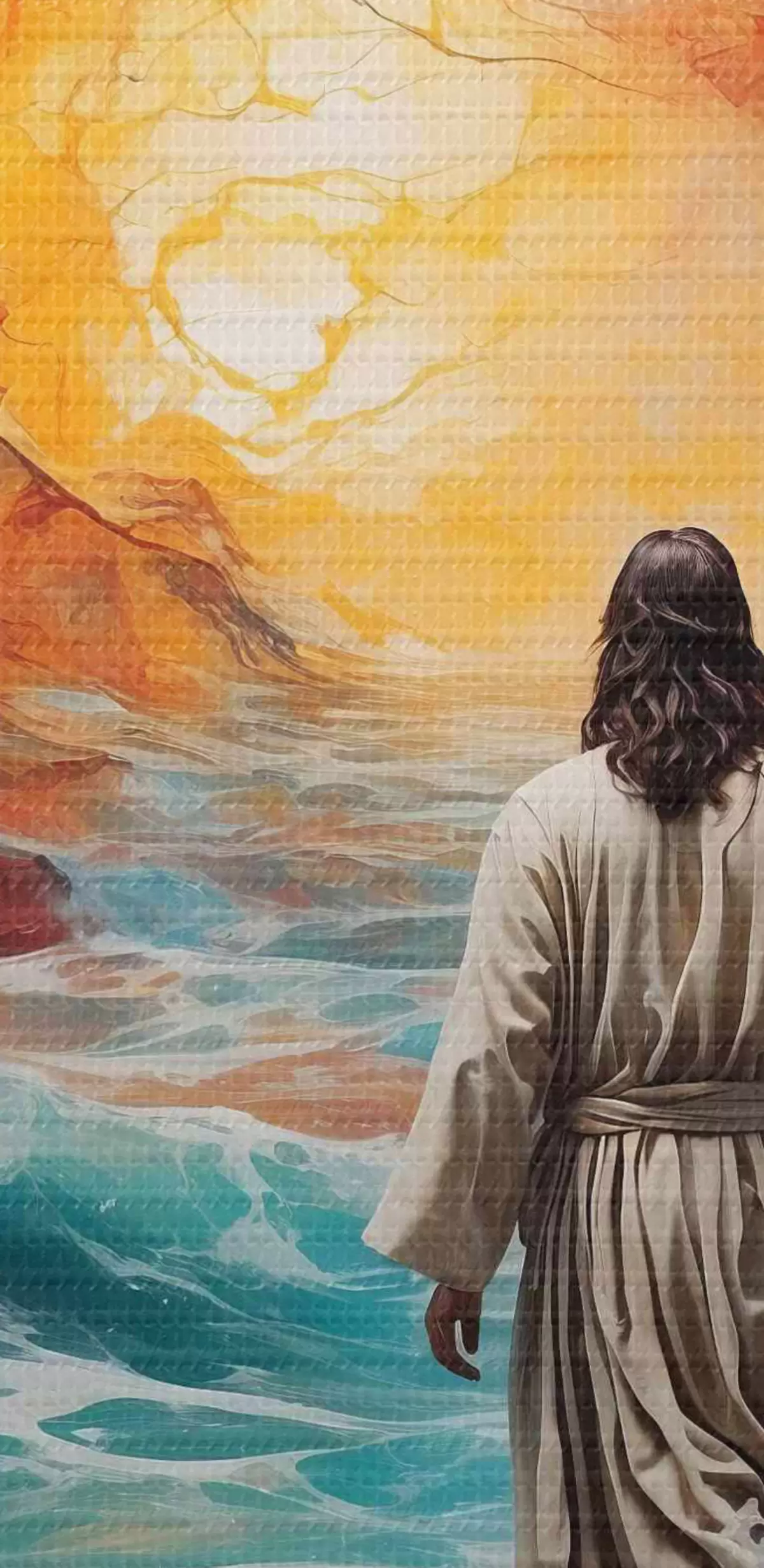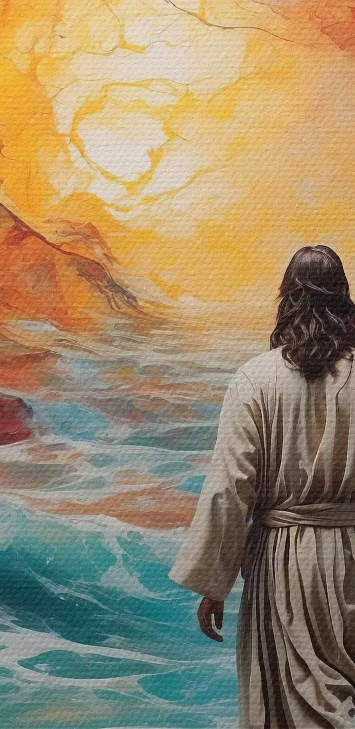 Tableaux rondes Un homme marche entre le ciel enflammé et la mer r38612