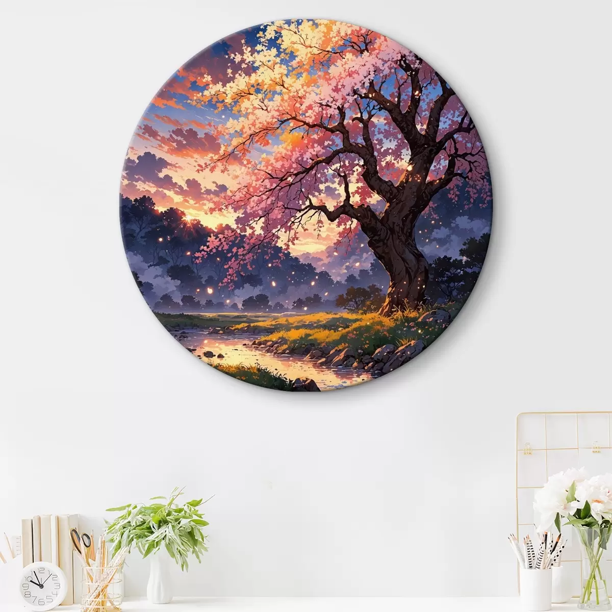 Tableaux rondes Un arbre aux fleurs roses traversé par une rivière r38645