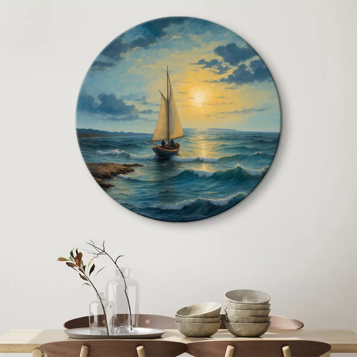 Tableaux rondes Un bateau solitaire sur une mer agitée la nuit Nr r38664