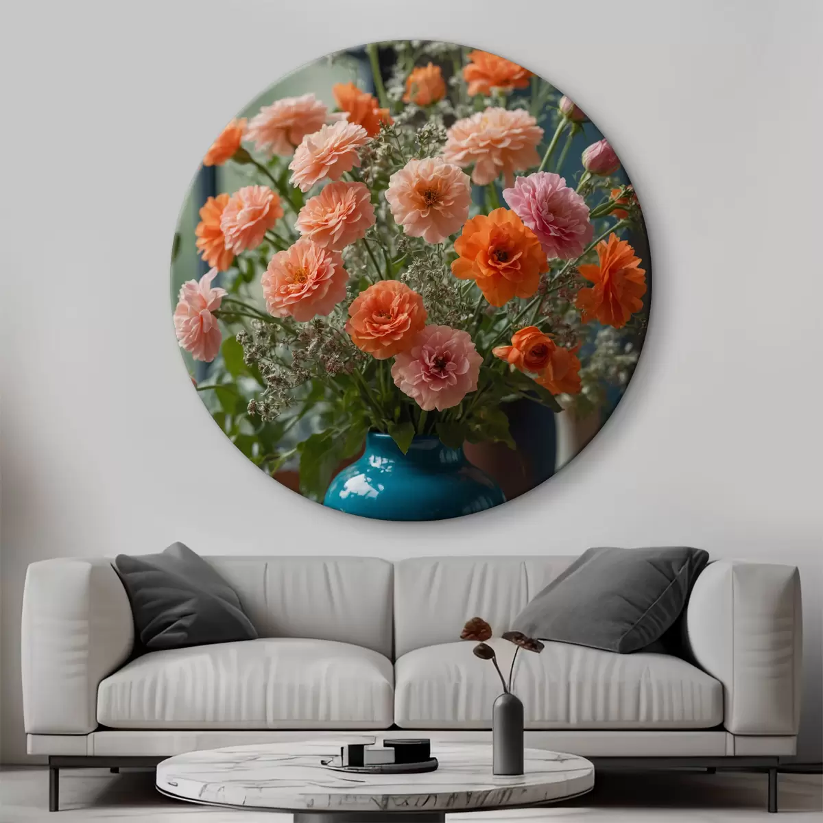 Tableaux rondes Bouquet de fleurs orange dans un vase bleu r38737