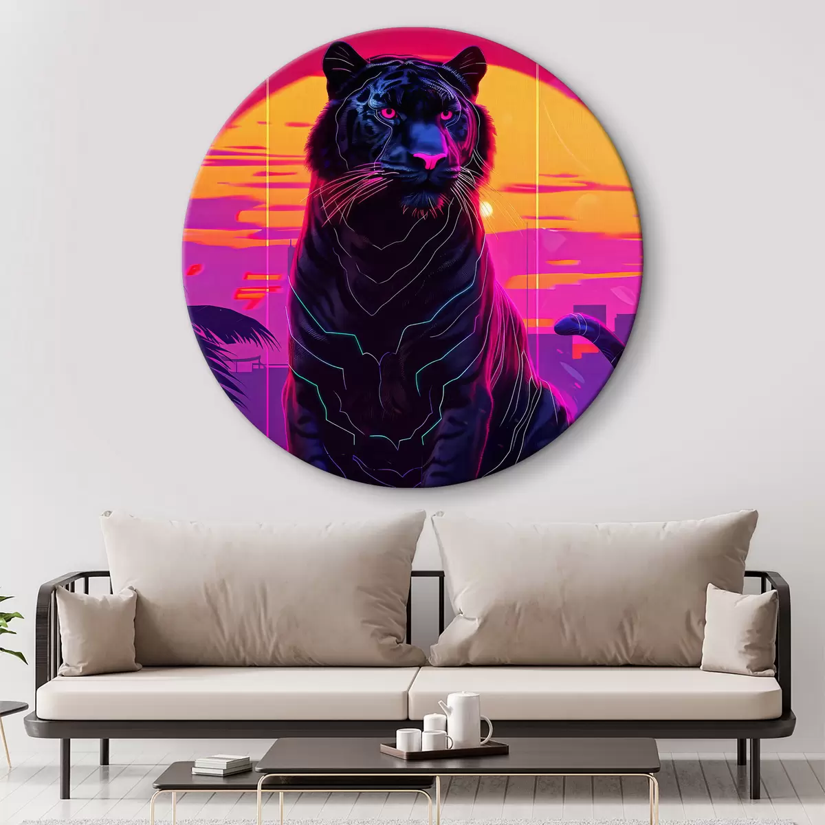 Tableaux rondes Panthère noire avec un coucher de soleil rose en arrière-plan Nr r38745