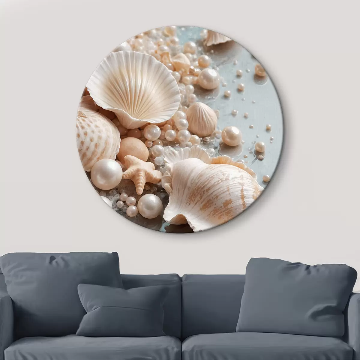 Tableaux rondes Assortiment de coquillages et de perles sur fond bleu clair Nr r38769