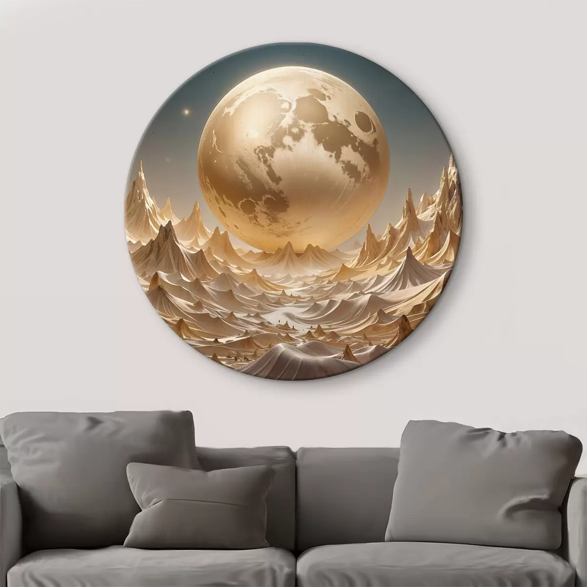 Tableaux rondes Pleine lune rougeoyante sur un paysage montagneux surréaliste avec des sommets r38775