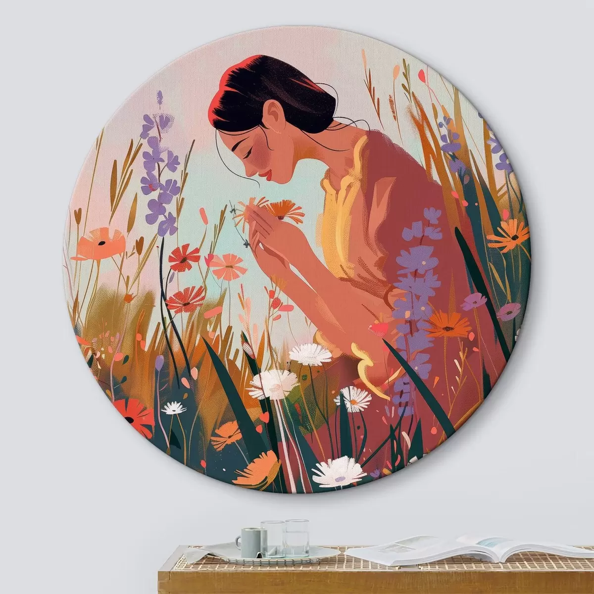 Tableaux rondes Une fille dans un champ de fleurs r38801